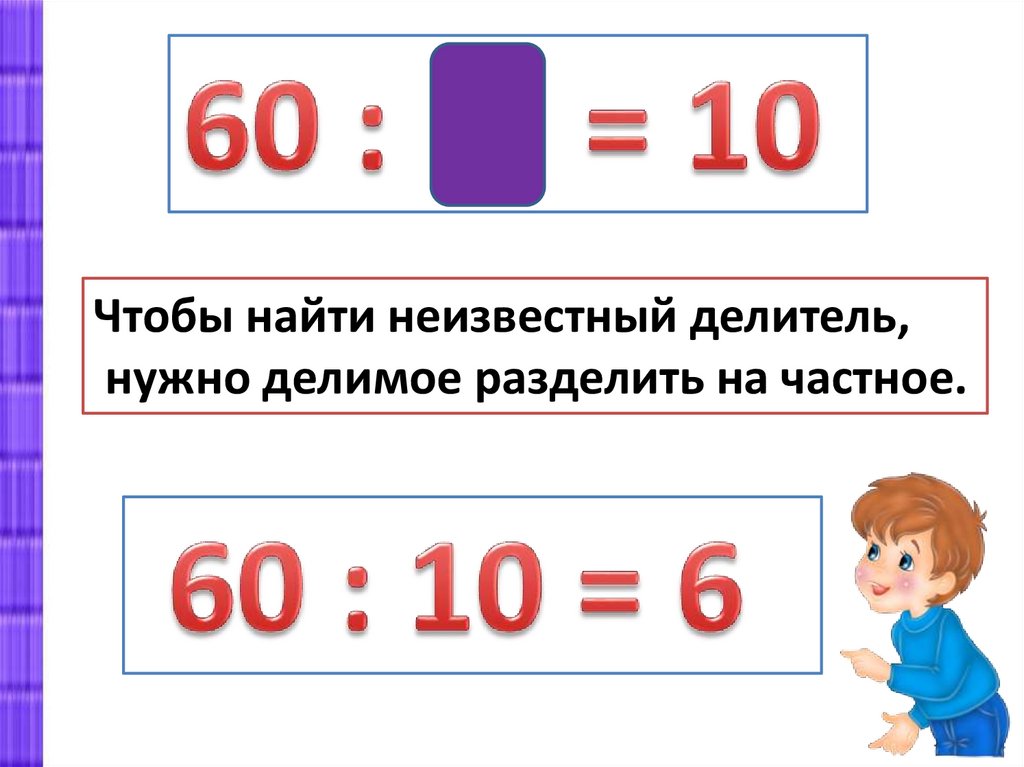 Чтобы найти неизвестный делитель,нужно делимое разделить на частное.