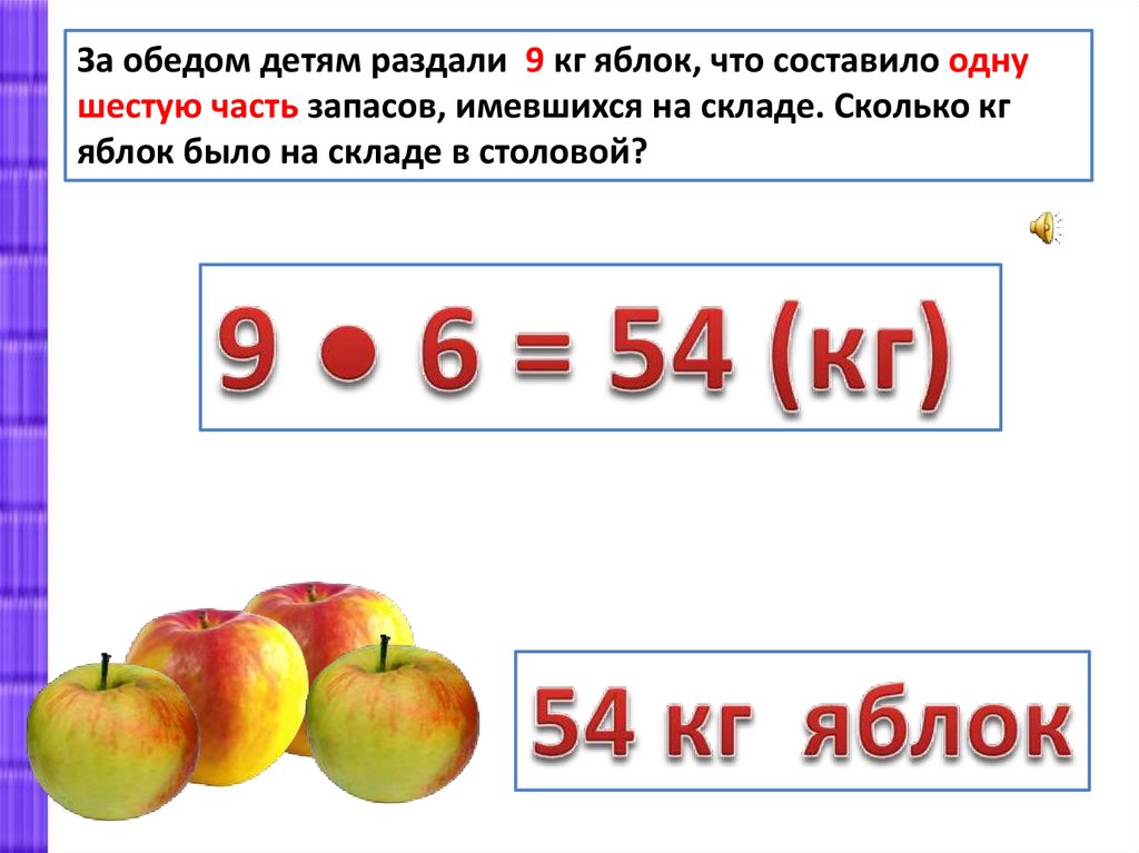 За обедом детям раздали 9 кг яблок, что составило однушестую часть запасов, имевшихся на складе. Сколько кг