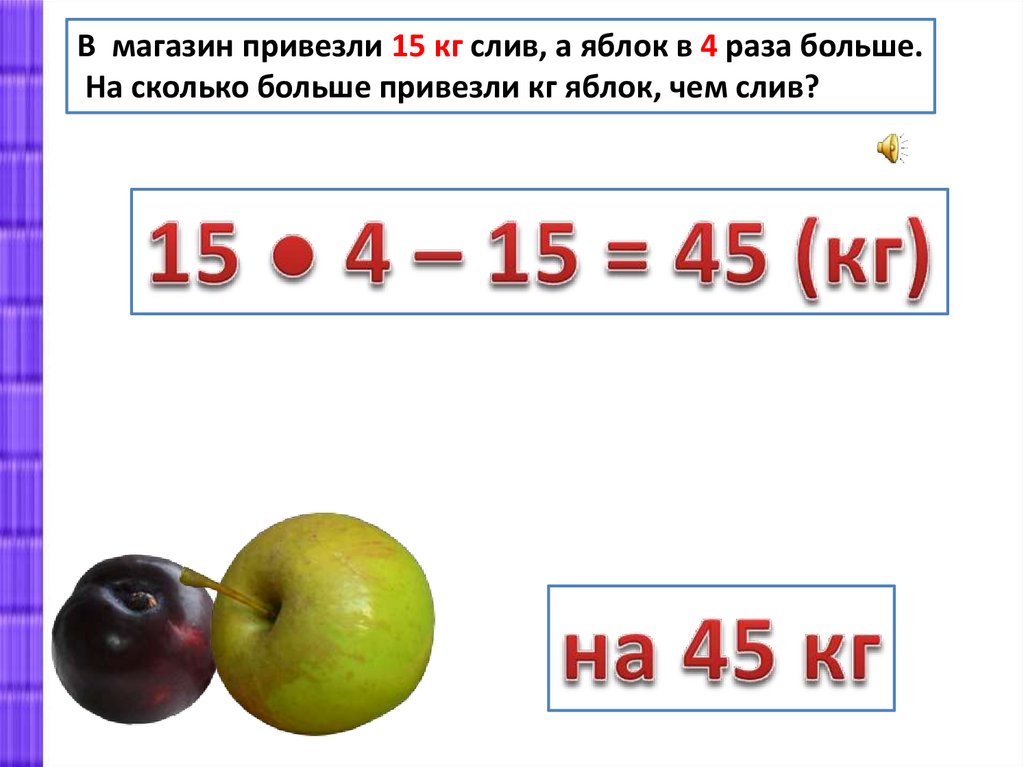 В магазин привезли 15 кг слив, а яблок в 4 раза больше.На сколько больше привезли кг яблок, чем слив?