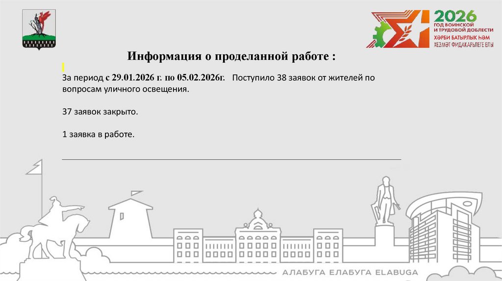 Информация о проделанной работе :За период с 29.01.2026 г. по 05.02.2026г. Поступило 38 заявок от жителей по