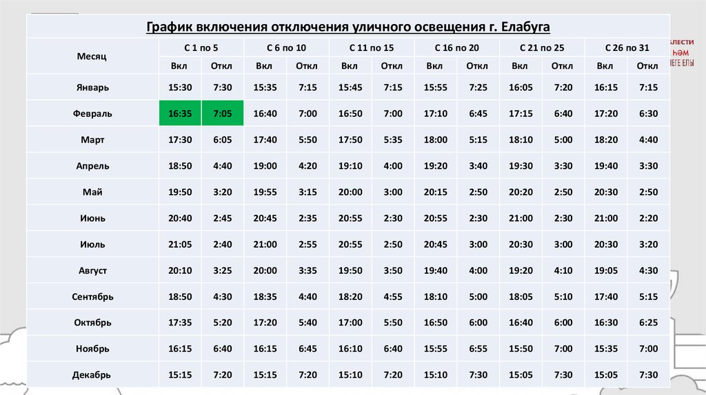График включения отключения уличного освещения г. ЕлабугаМесяц