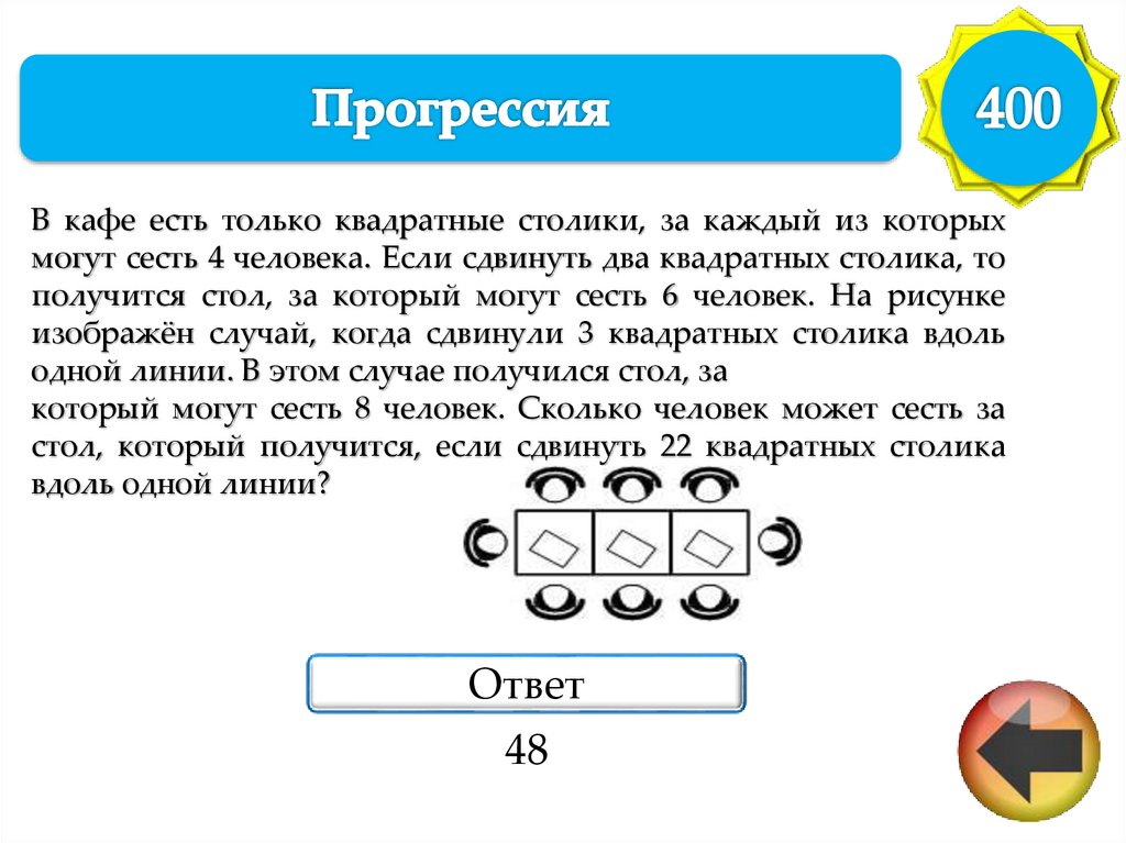 В кафе есть только квадратные столики, за каждый из которых могутсесть 4 человека. Если сдвинуть два квадратных столика, то