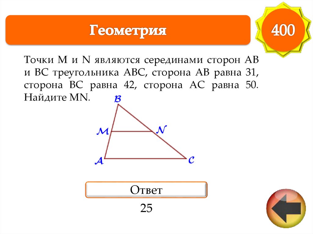 Точки M и N являются серединами сторон ABи BC треугольника ABC, сторона AB равна 31,