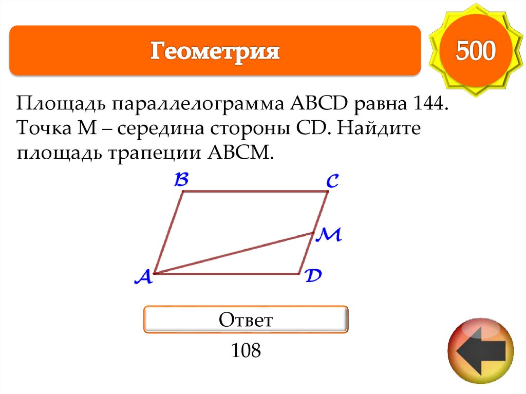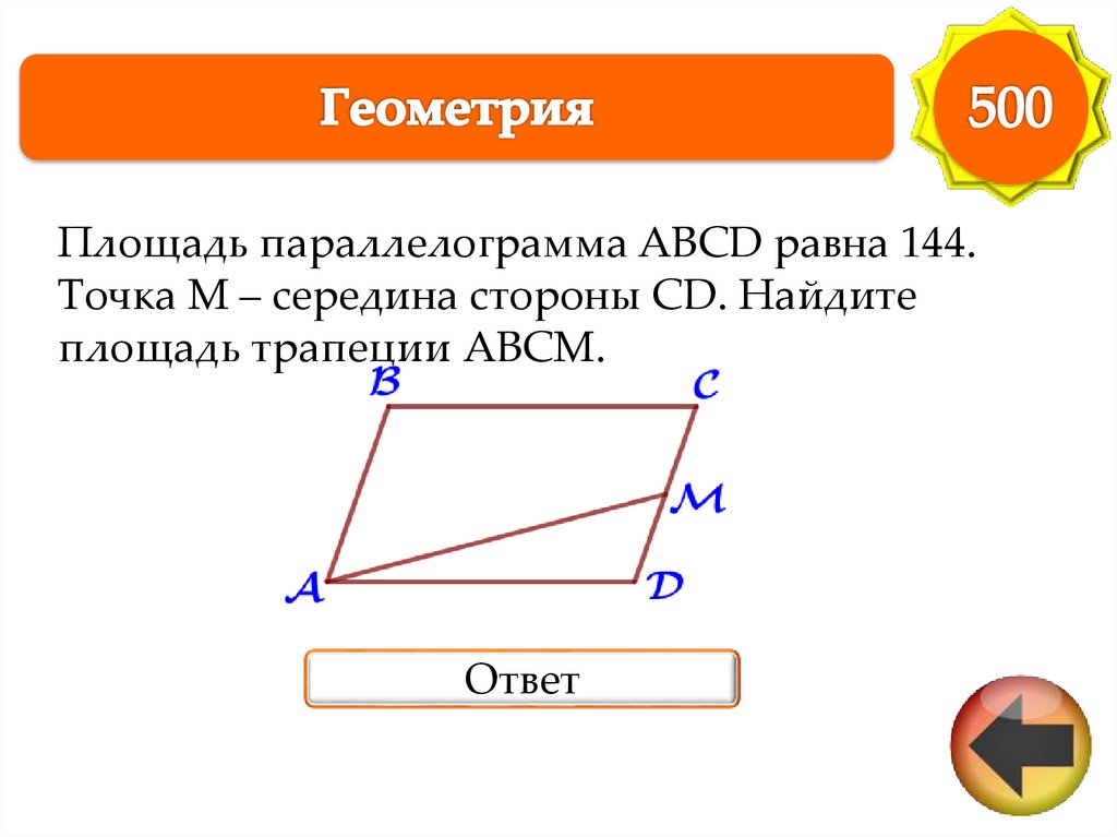 Площадь параллелограмма ABCD равна 144.Точка M – середина стороны CD. Найдите