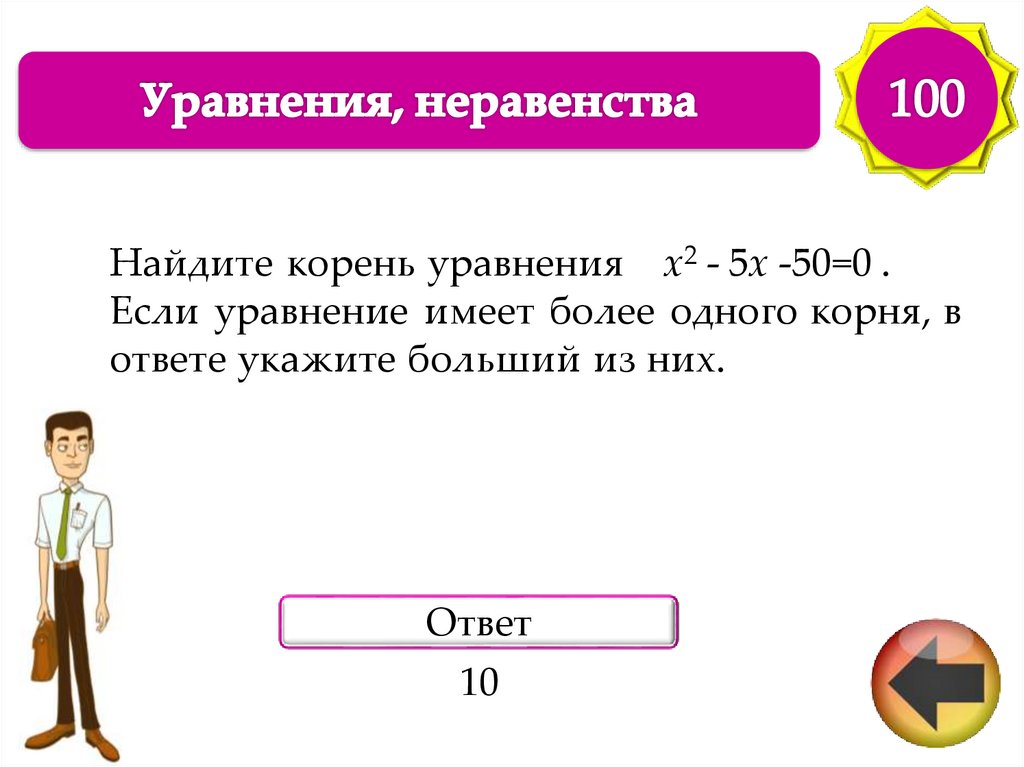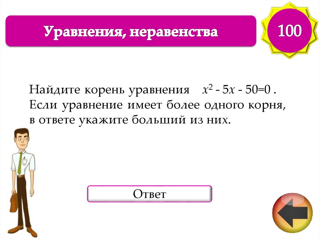 Найдите корень уравнения x2 - 5x -50=0 .Если уравнение имеет более одного корня, в