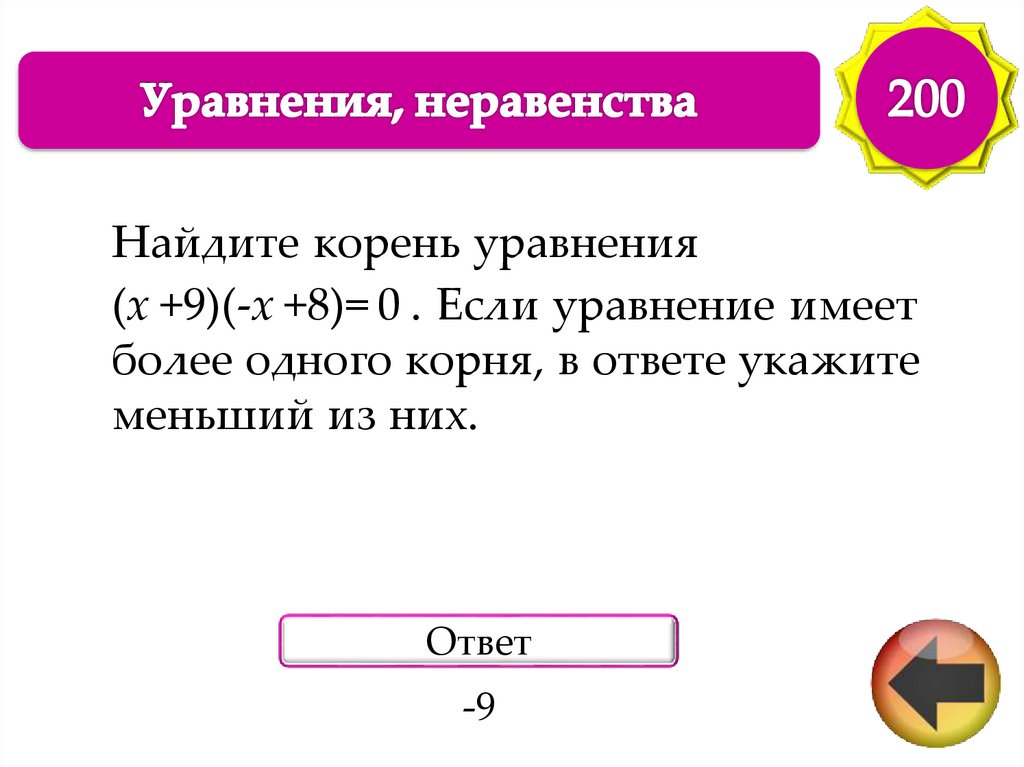 Найдите корень уравнения(x +9)(-x +8)= 0 . Если уравнение имеет