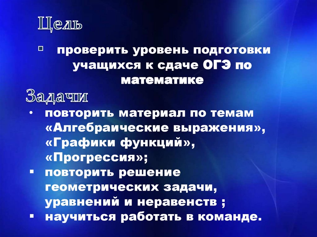 Цель: проверить уровень подготовкиучеников к сдаче ОГЭ по математике