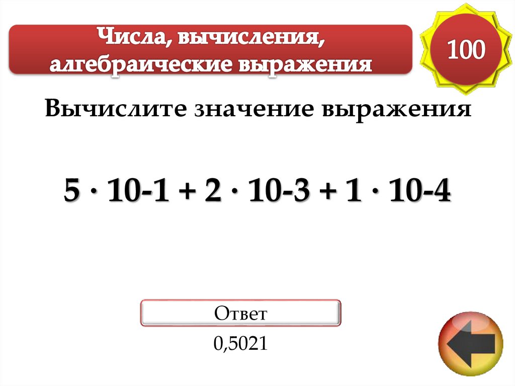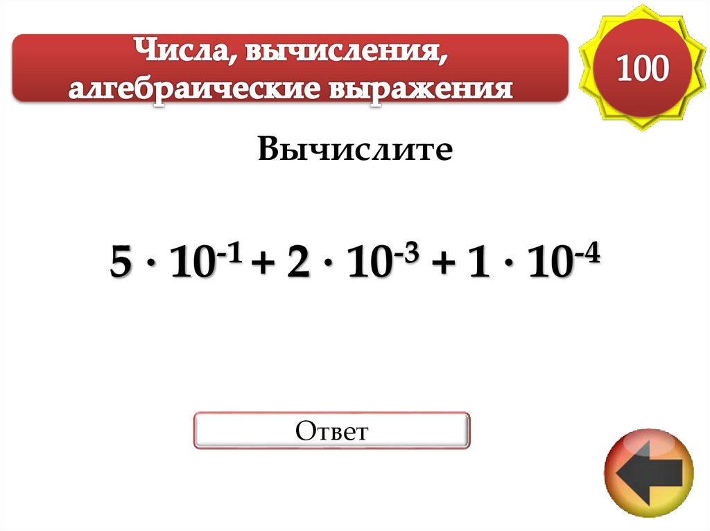 Вычислите значение выражения5 ∙ 10-1 + 2 ∙ 10-3 + 1 ∙ 10-4