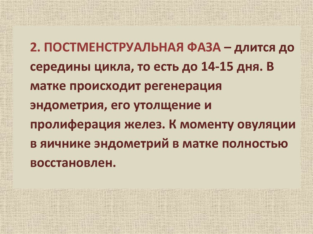 2. ПОСТМЕНСТРУАЛЬНАЯ ФАЗА – длится досередины цикла, то есть до 14-15 дня. В