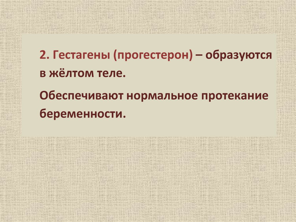 2. Гестагены (прогестерон) – образуютсяв жёлтом теле.