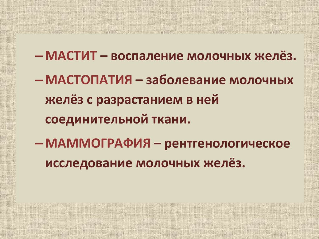 – МАСТИТ – воспаление молочных желёз.– МАСТОПАТИЯ – заболевание молочных
