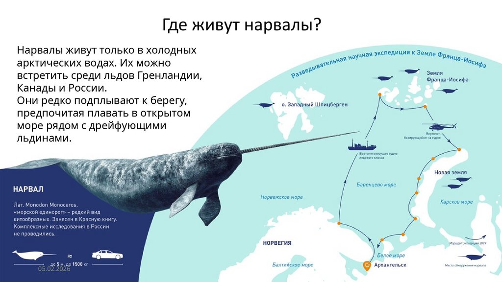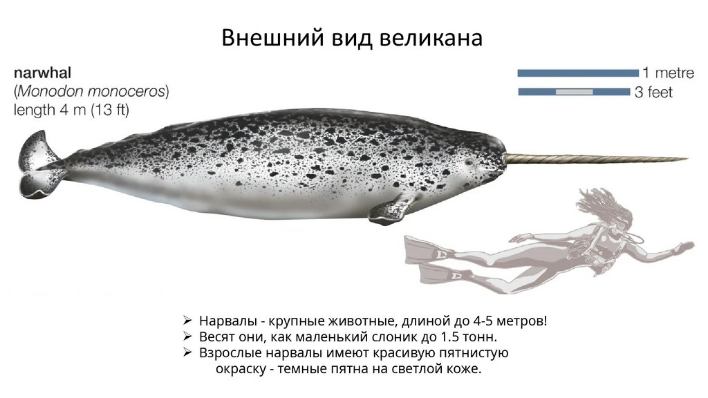Ø Нарвалы - крупные животные, длиной до 4-5 метров!