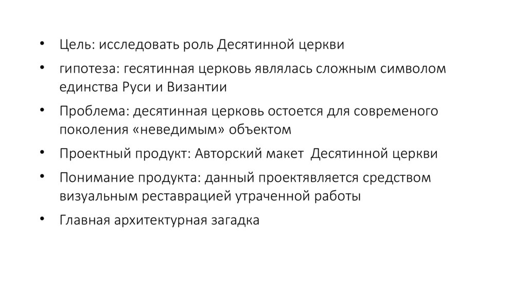 • Цель: исследовать роль Десятинной церкви• гипотеза: гесятинная церковь являлась сложным символом