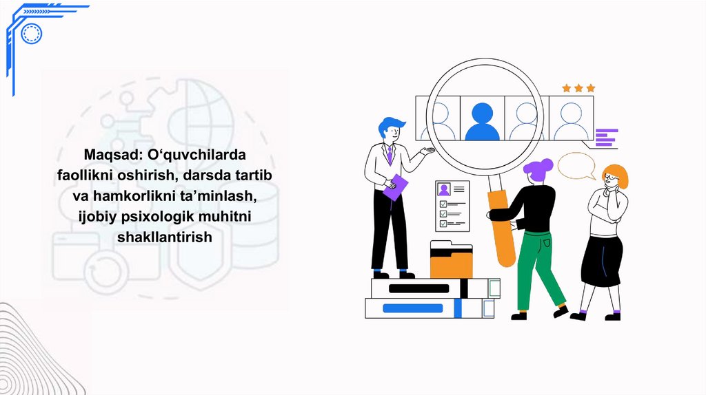 Maqsad: O‘quvchilardafaollikni oshirish, darsda tartib