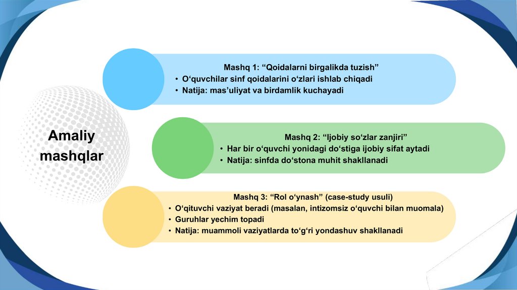 Mashq 1: “Qoidalarni birgalikda tuzish”• O‘quvchilar sinf qoidalarini o‘zlari ishlab chiqadi