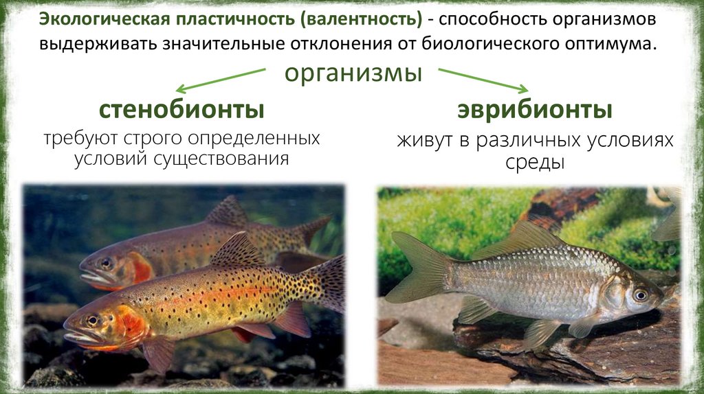 Экологическая пластичность (валентность) - способность организмоввыдерживать значительные отклонения от биологического оптимума.