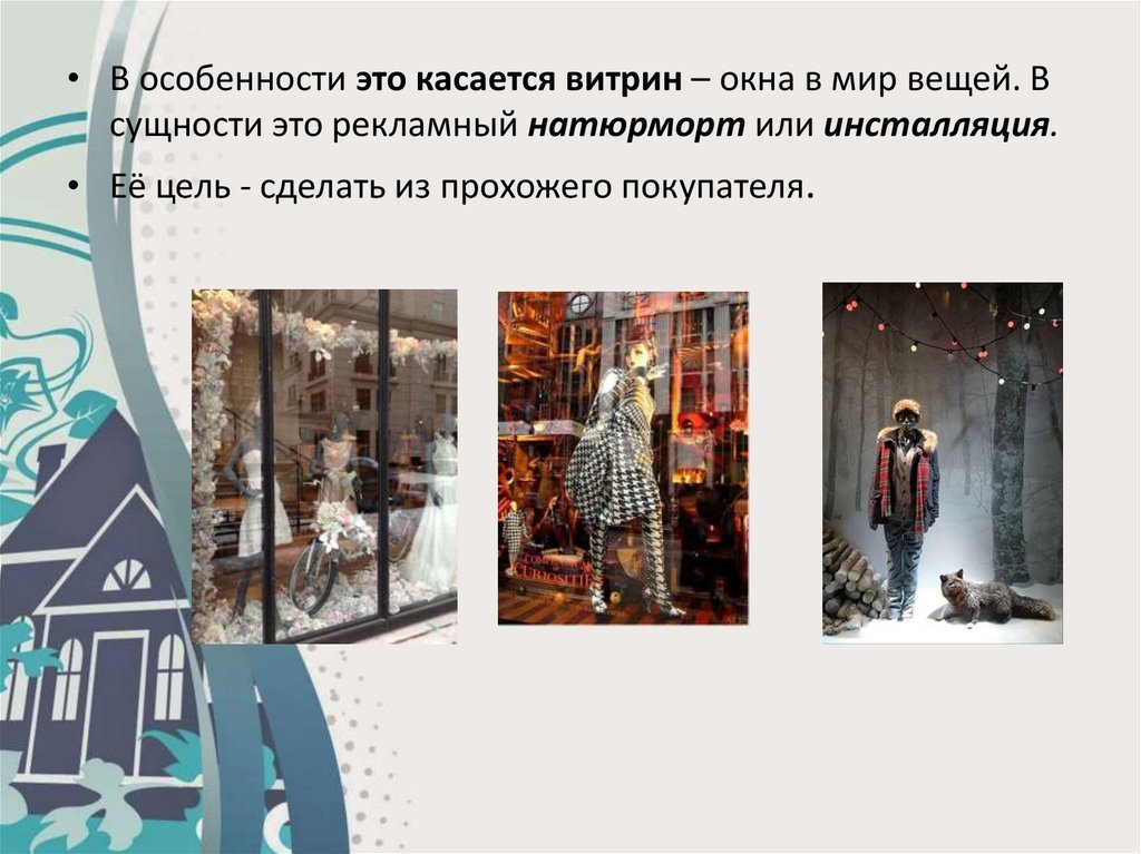 • В особенности это касается витрин – окна в мир вещей. Всущности это рекламный натюрморт или инсталляция.