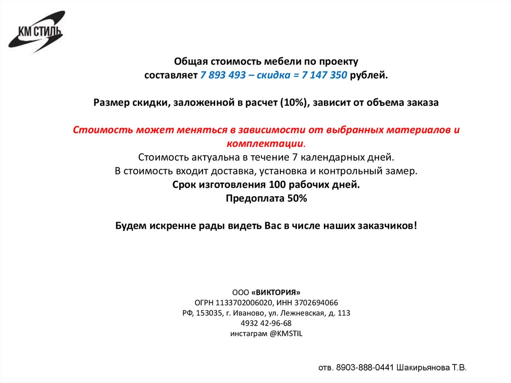 Общая стоимость мебели по проектусоставляет 7 893 493 – скидка = 7 147 350 рублей.
