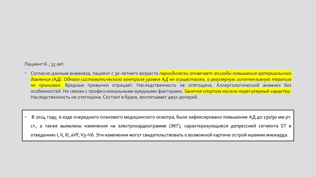 Пациент К., 35 лет.• Согласно данным анамнеза, пациент с 30-летнего возраста периодически отмечает эпизоды повышения артериального