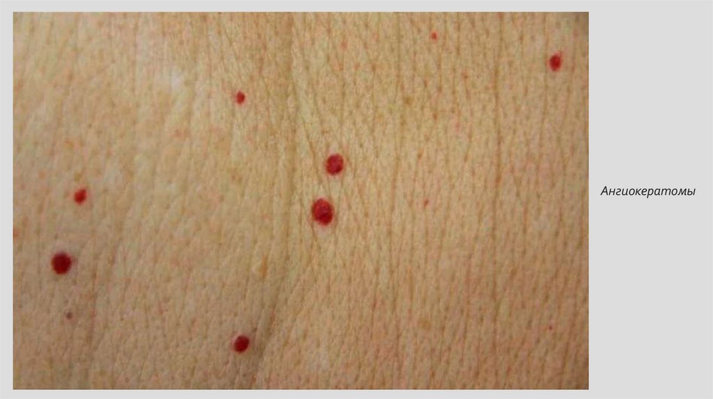 • В возрасте 17 лет у пациента были выявлены ангиокератомы на коже конечностей и туловища, а