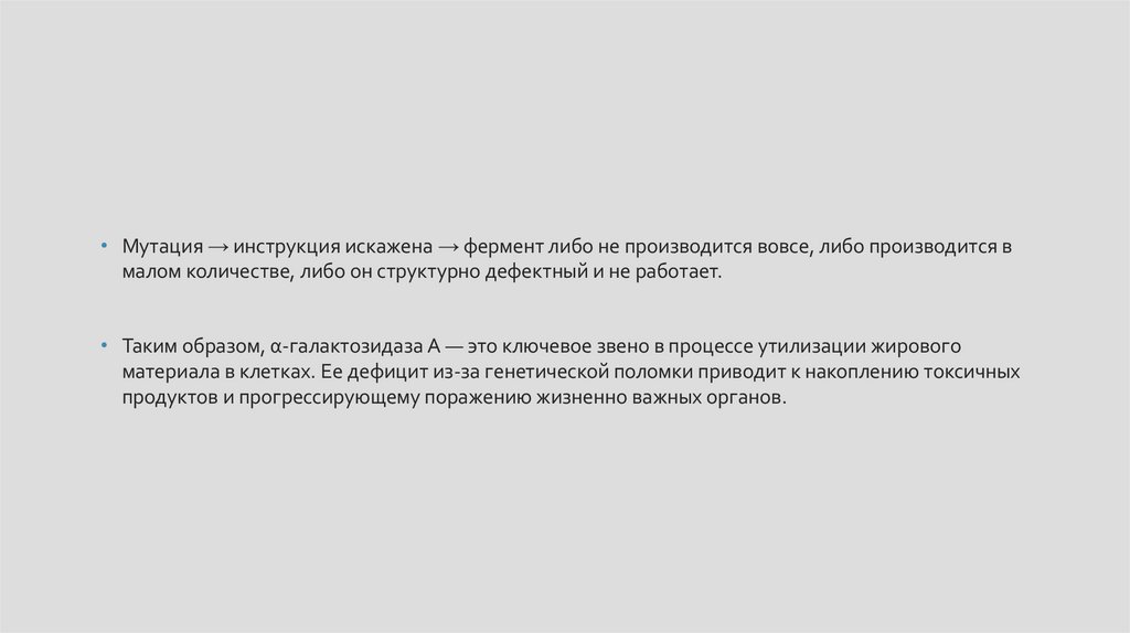 • Таким образом, α-галактозидаза А — это ключевое звено в процессе утилизации жирового