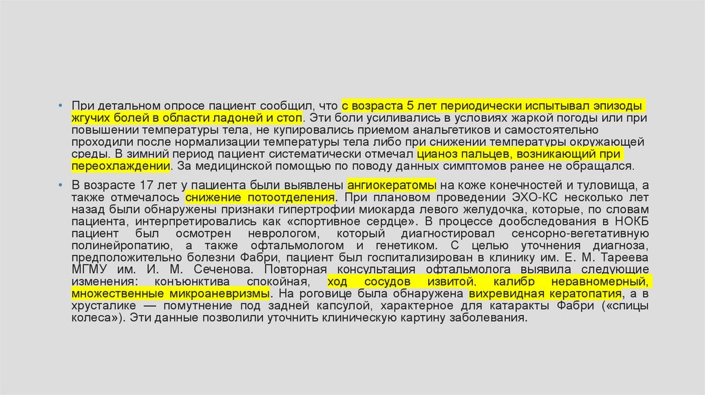 • При детальном опросе пациент сообщил, что с возраста 5 лет периодически испытывал эпизодыжгучих болей в области ладоней и стоп. Эти боли усиливались в условиях жаркой погоды или при