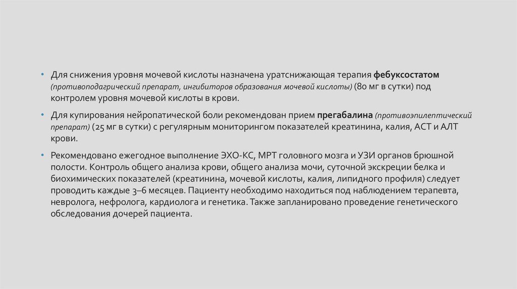 • Для снижения уровня мочевой кислоты назначена уратснижающая терапия фебуксостатом(противоподагрический препарат, ингибиторов образования мочевой кислоты) (80 мг в сутки) под