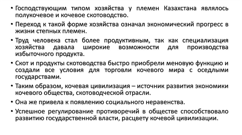 • Господствующим типом хозяйства у племен Казахстана являлосьполукочевое и кочевое скотоводство.