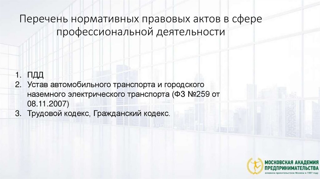Перечень нормативных правовых актов в сферепрофессиональной деятельности