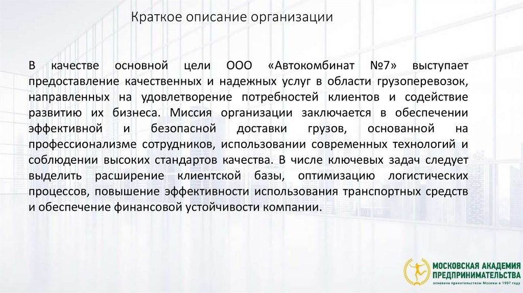 Краткое описание организацииВ качестве основной цели ООО «Автокомбинат №7» выступает