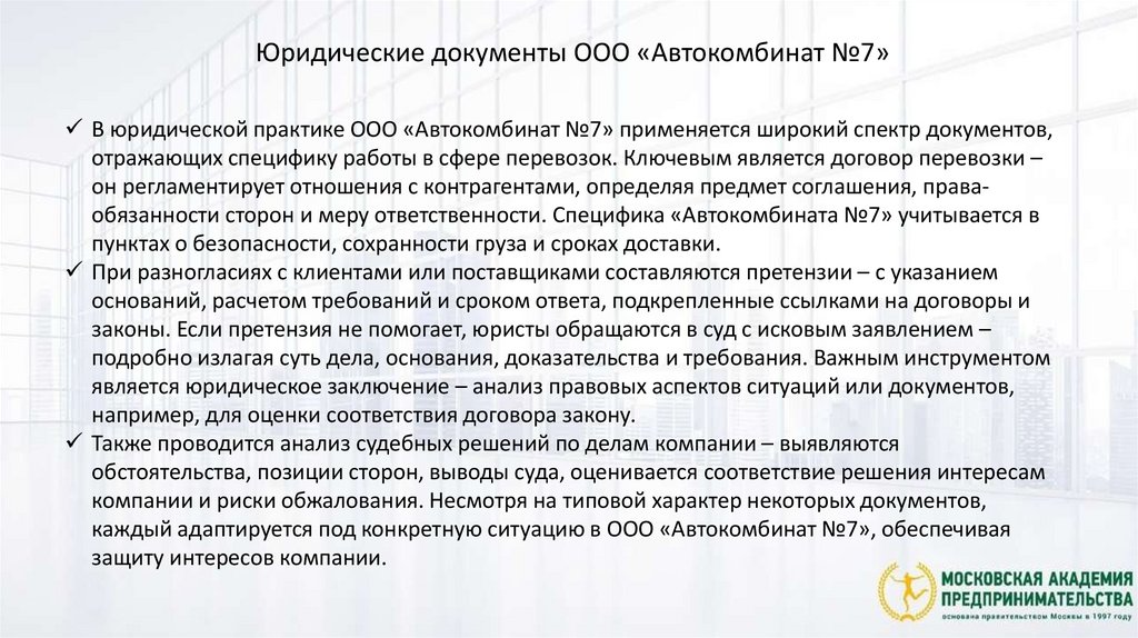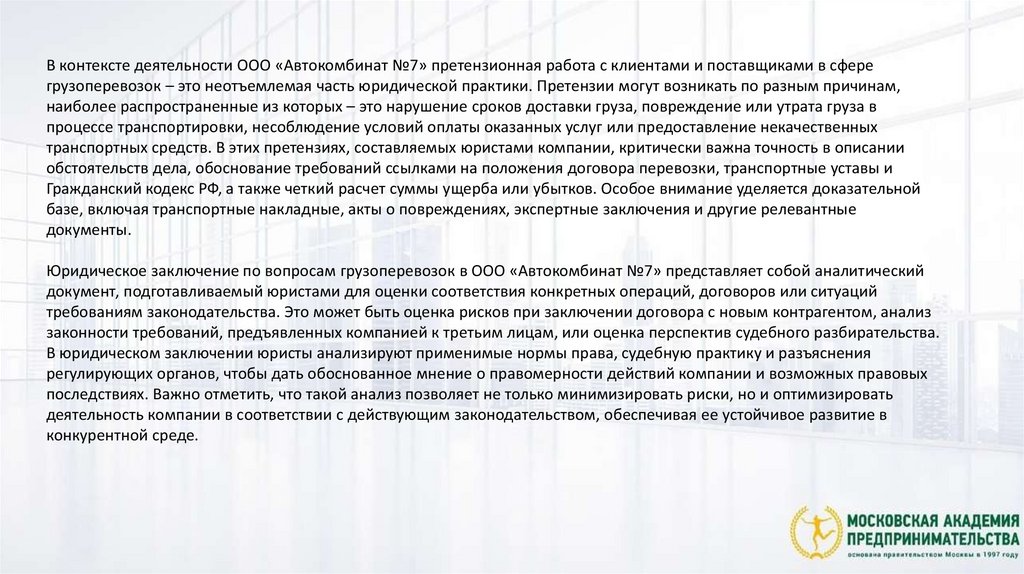 Юридическое заключение по вопросам грузоперевозок в ООО «Автокомбинат №7» представляет собой аналитический
