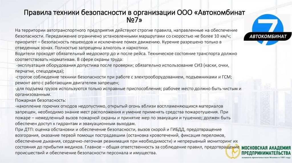 Правила техники безопасности в организации ООО «Автокомбинат№7»