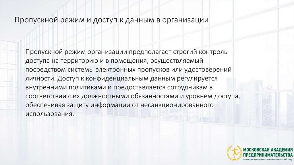 Пропускной режим и доступ к данным в организацииПропускной режим организации предполагает строгий контроль