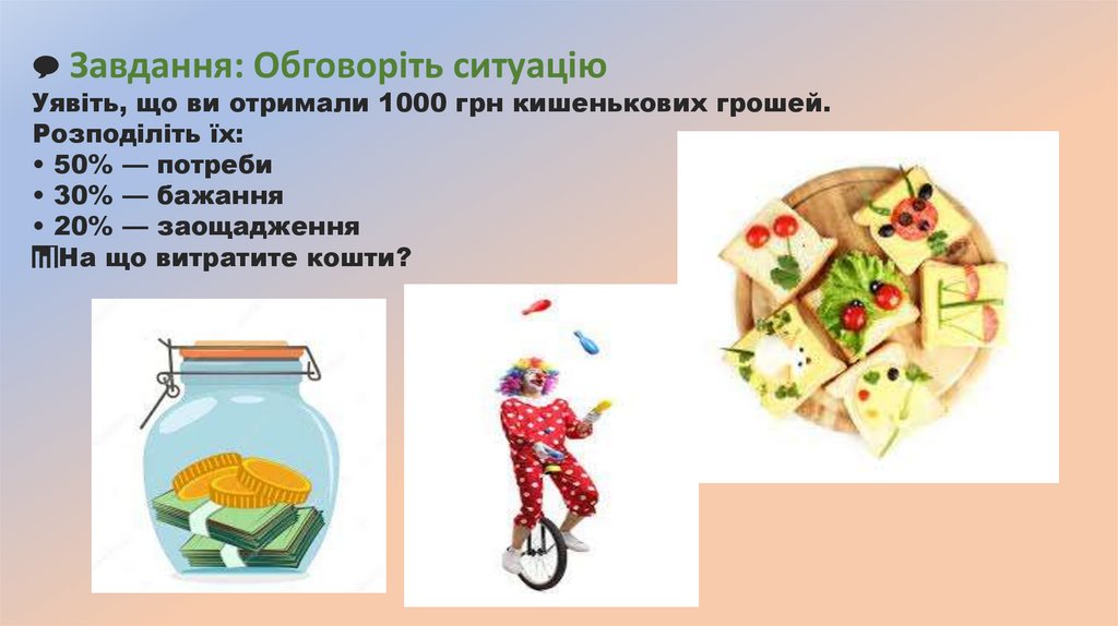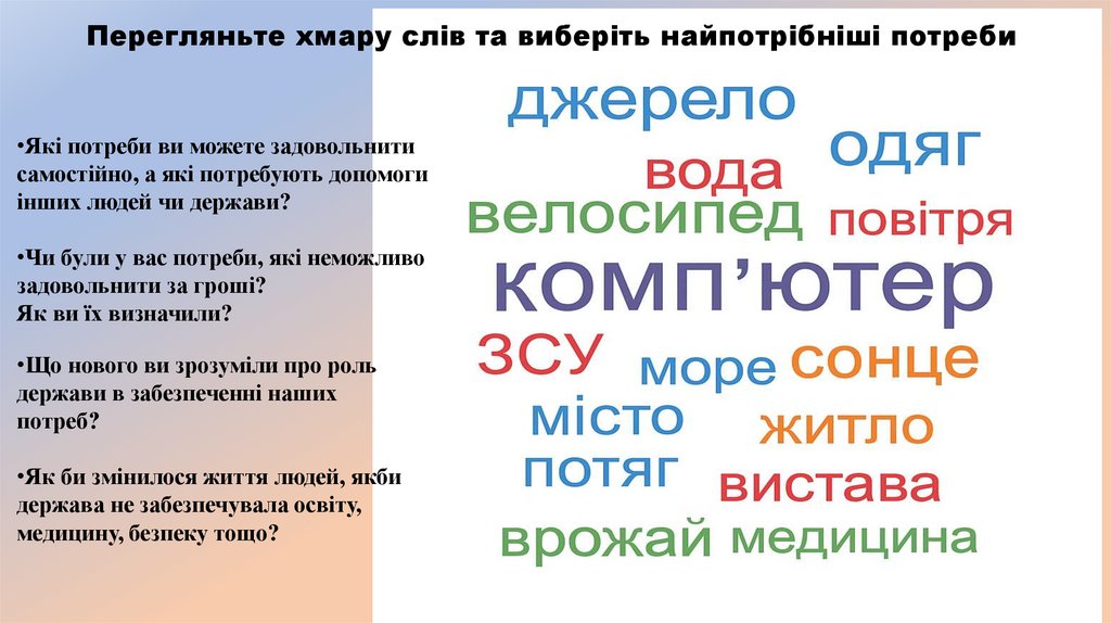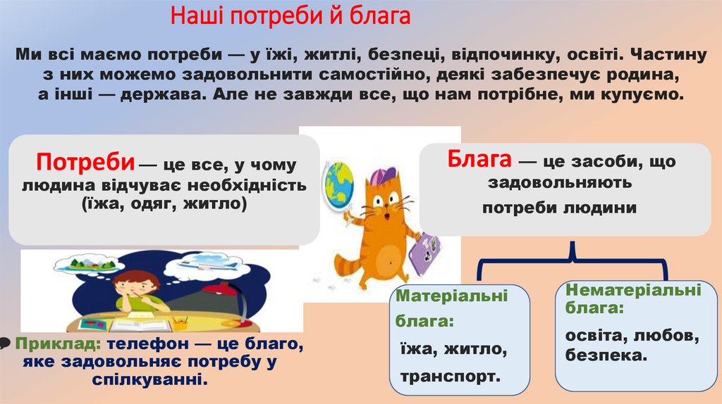 Наші потреби й благаМи всі маємо потреби — у їжі, житлі, безпеці, відпочинку, освіті. Частину