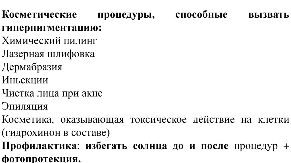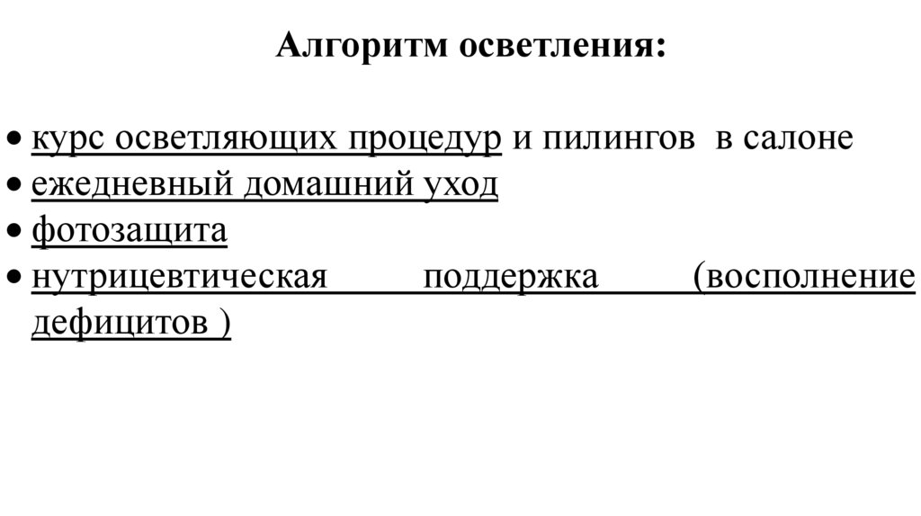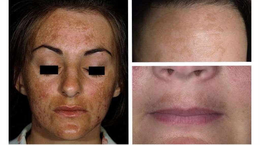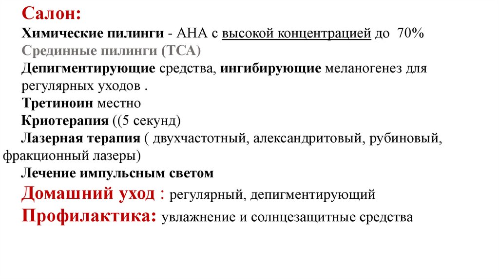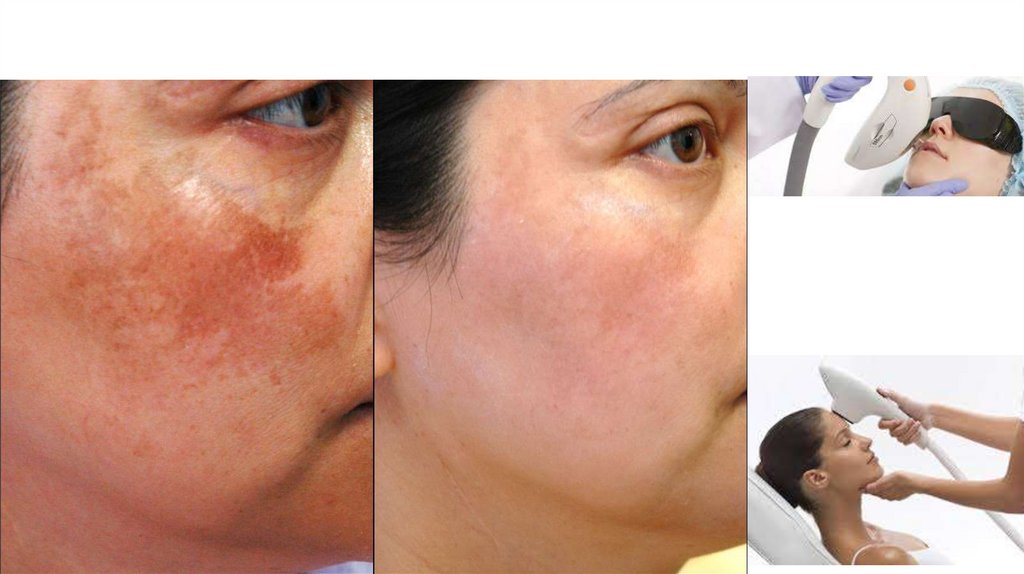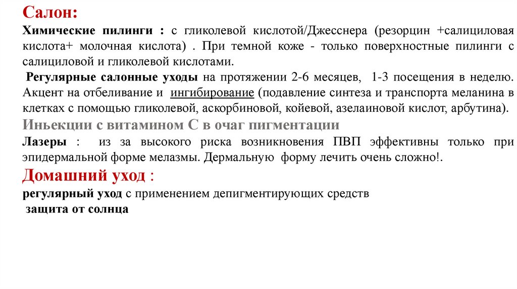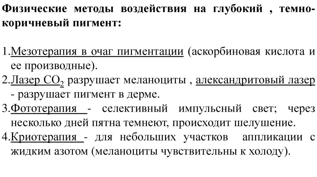 Физические методы воздействия на глубокий , темнокоричневый пигмент:1.Мезотерапия в очаг пигментации (аскорбиновая кислота и