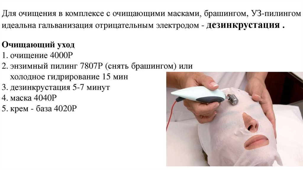 Для очищения в комплексе с очищающими масками, брашингом, УЗ-пилингомидеальна гальванизация отрицательным электродом - дезинкрустация .