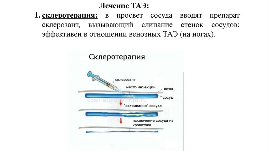 Лечение ТАЭ:1. склеротерапия: в просвет сосуда вводят препарат