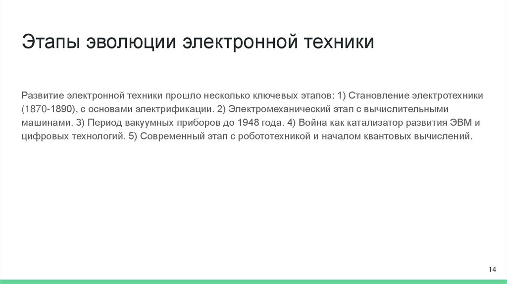 Этапы эволюции электронной техникиРазвитие электронной техники прошло несколько ключевых этапов: 1) Становление электротехники