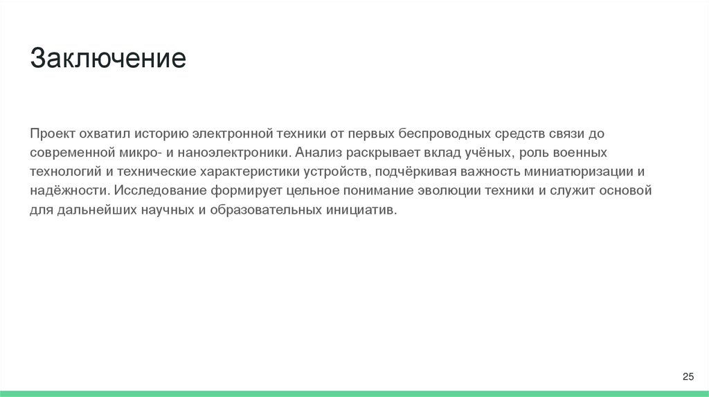 ЗаключениеПроект охватил историю электронной техники от первых беспроводных средств связи до