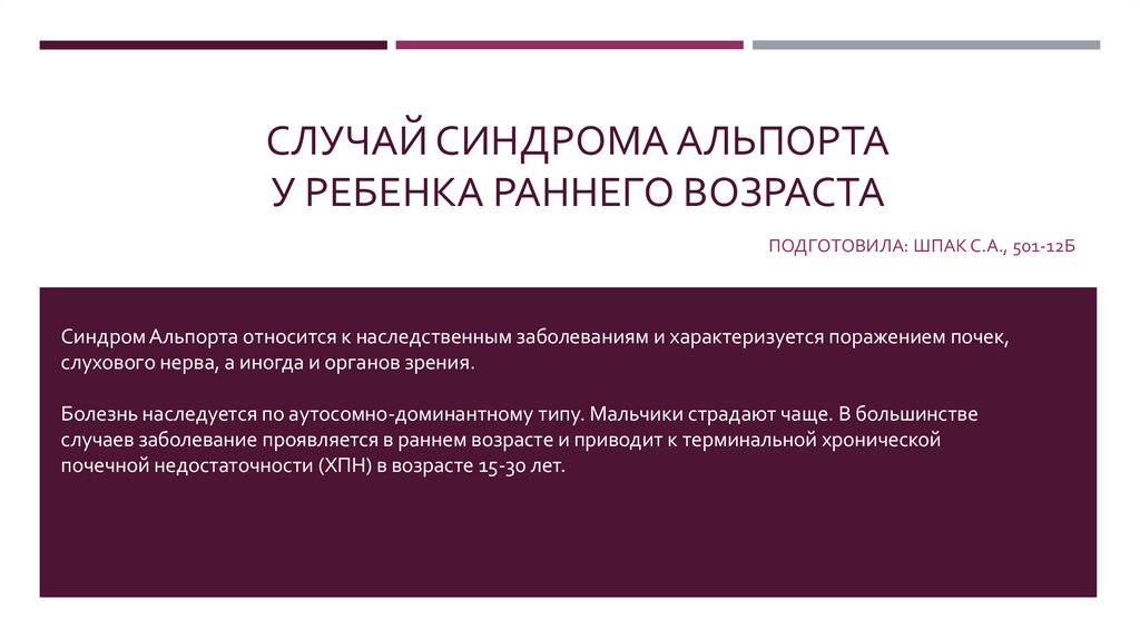 ПОДГОТОВИЛА: ШПАК С.А., 501-12БСиндром Альпорта относится к наследственным заболеваниям и характеризуется поражением почек,