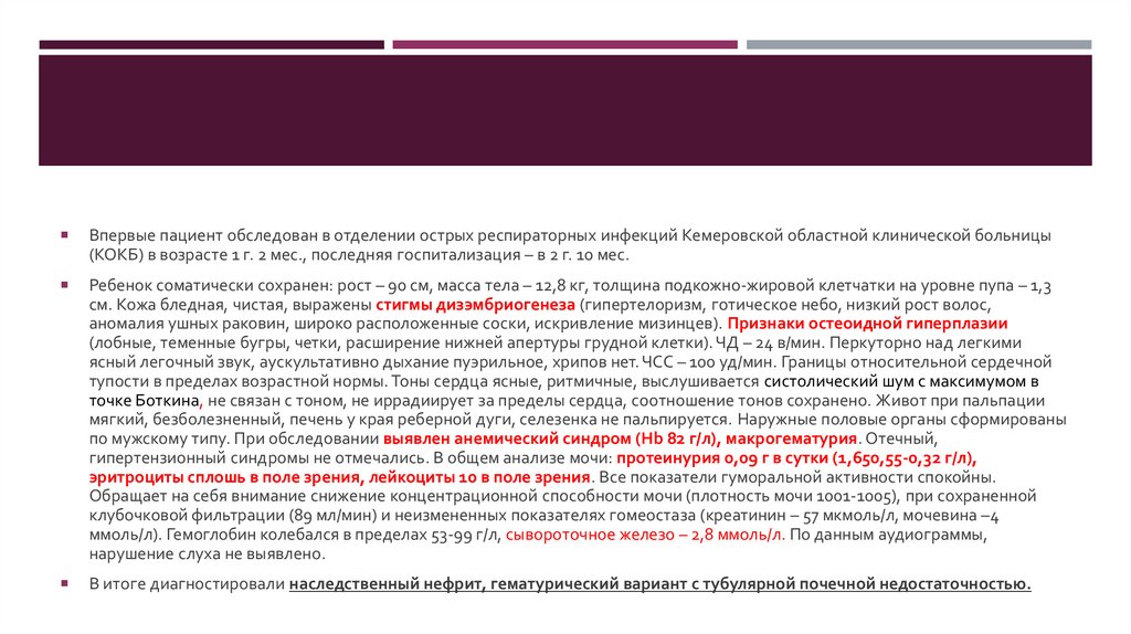 ТЕЧЕНИЕ ЗАБОЛЕВАНИЯВпервые изменения в анализах мочи выявлены в возрасте 1 месяца на фоне ОРВИ в виде следовой