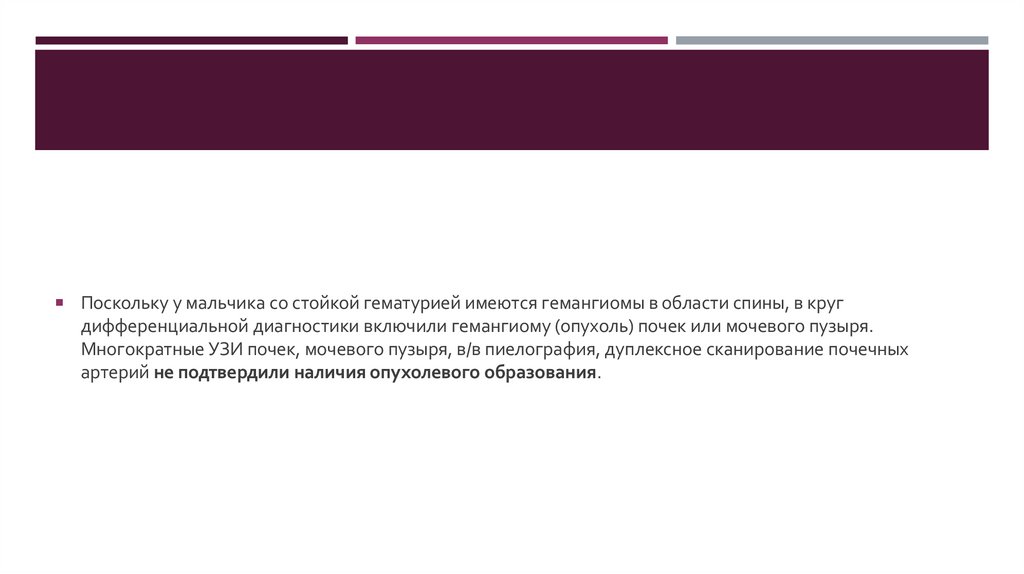Поскольку у мальчика со стойкой гематурией имеются гемангиомы в области спины, в кругдифференциальной диагностики включили гемангиому (опухоль) почек или мочевого пузыря.