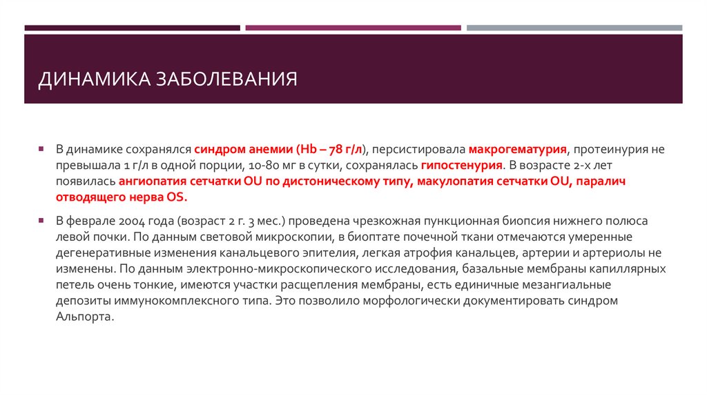 ДИНАМИКА ЗАБОЛЕВАНИЯВ динамике сохранялся синдром анемии (Нb – 78 г/л), персистировала макрогематурия, протеинурия не