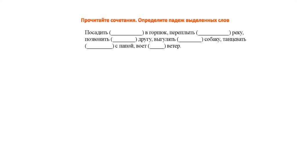 Посадить (___________) в горшок, переплыть (___________) реку,позвонить (________) другу, выгулять (________) собаку, танцевать