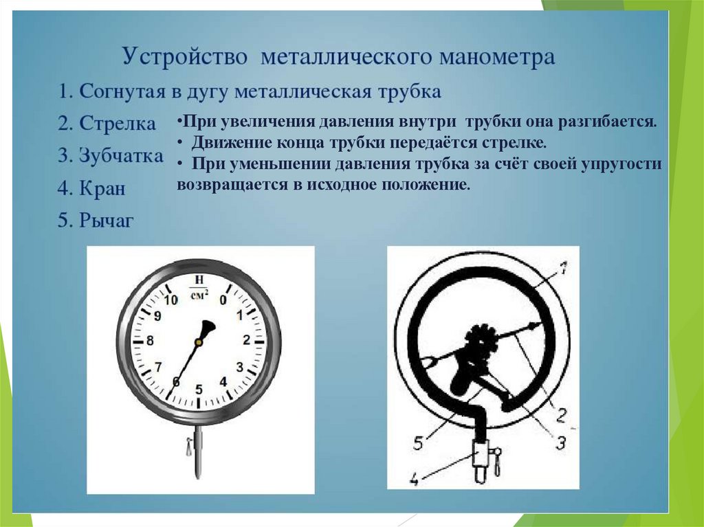 •При увеличения давления внутри трубки она разгибается.• Движение конца трубки передаётся стрелке.