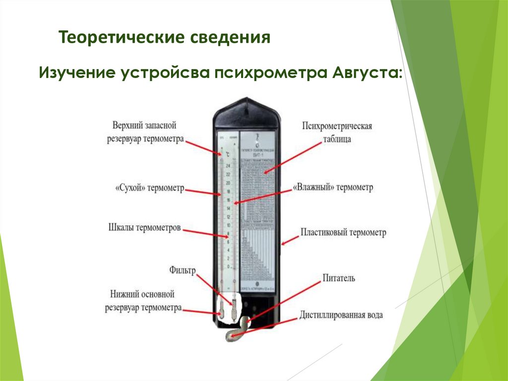 Теоретические сведенияИзучение устройсва психрометра Августа:
