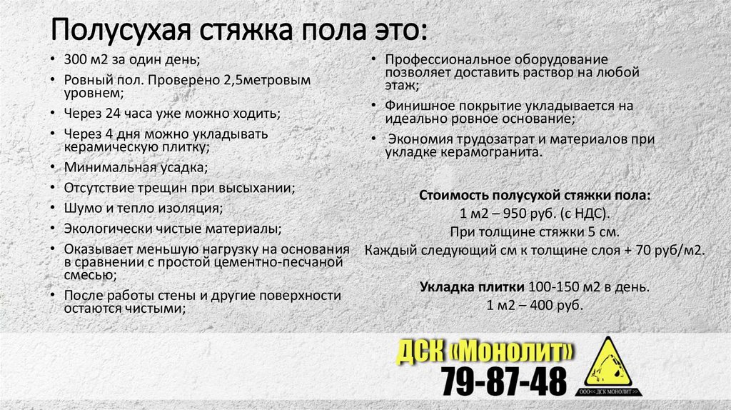 • Оказывает меньшую нагрузку на основания Каждый следующий см к толщине слоя + 70 руб/м2.