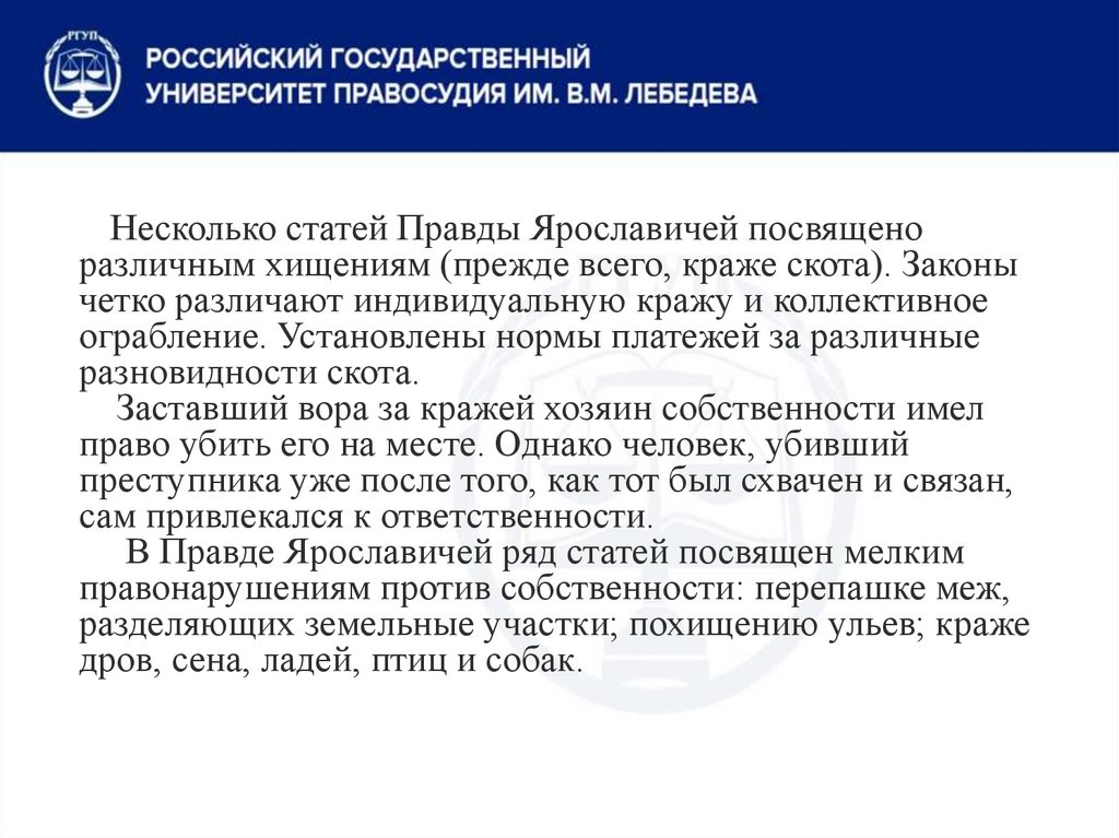 Несколько статей Правды Ярославичей посвященоразличным хищениям (прежде всего, краже скота). Законы