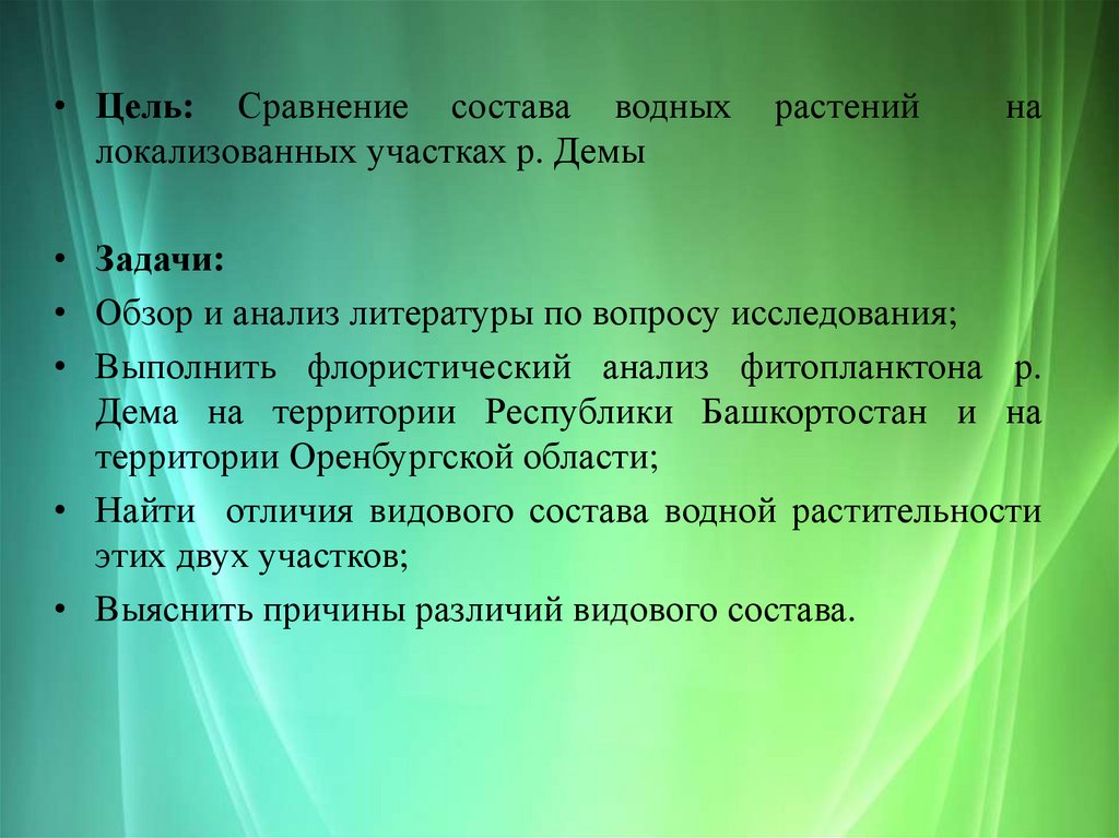 • Цель: Сравнение состава водныхлокализованных участках р. Демы