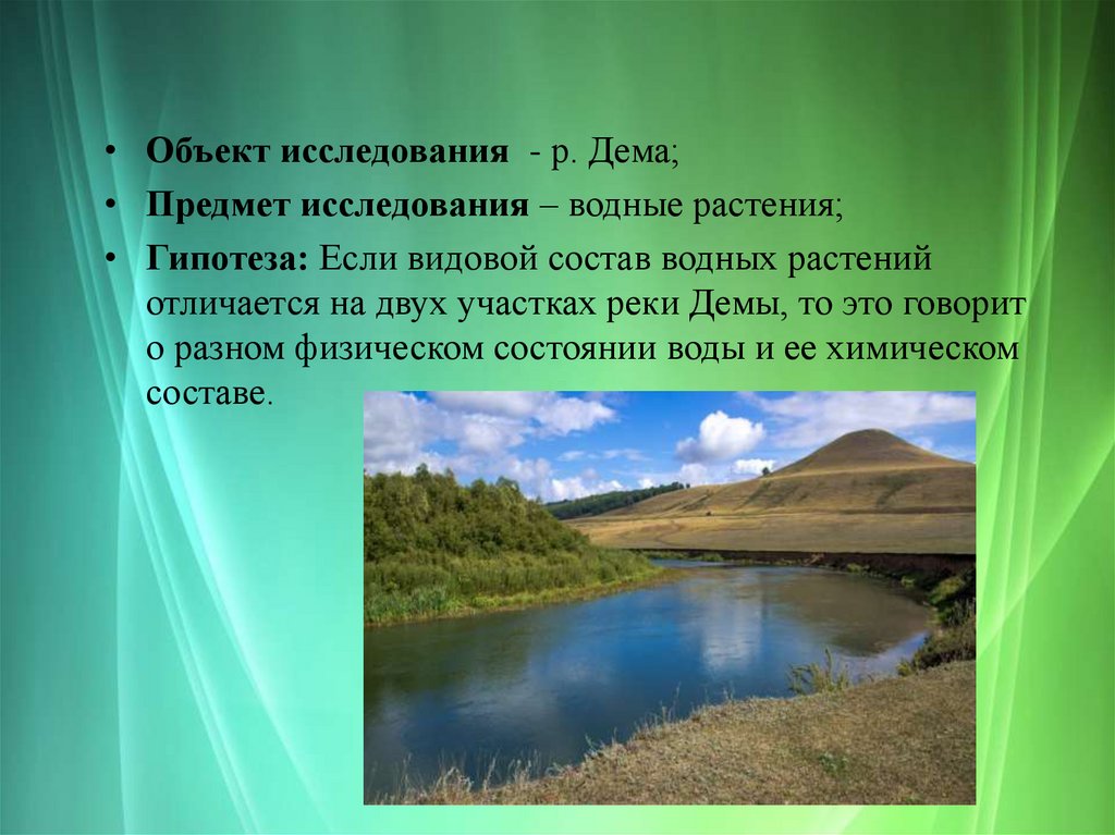 • Объект исследования - р. Дема;• Предмет исследования – водные растения;